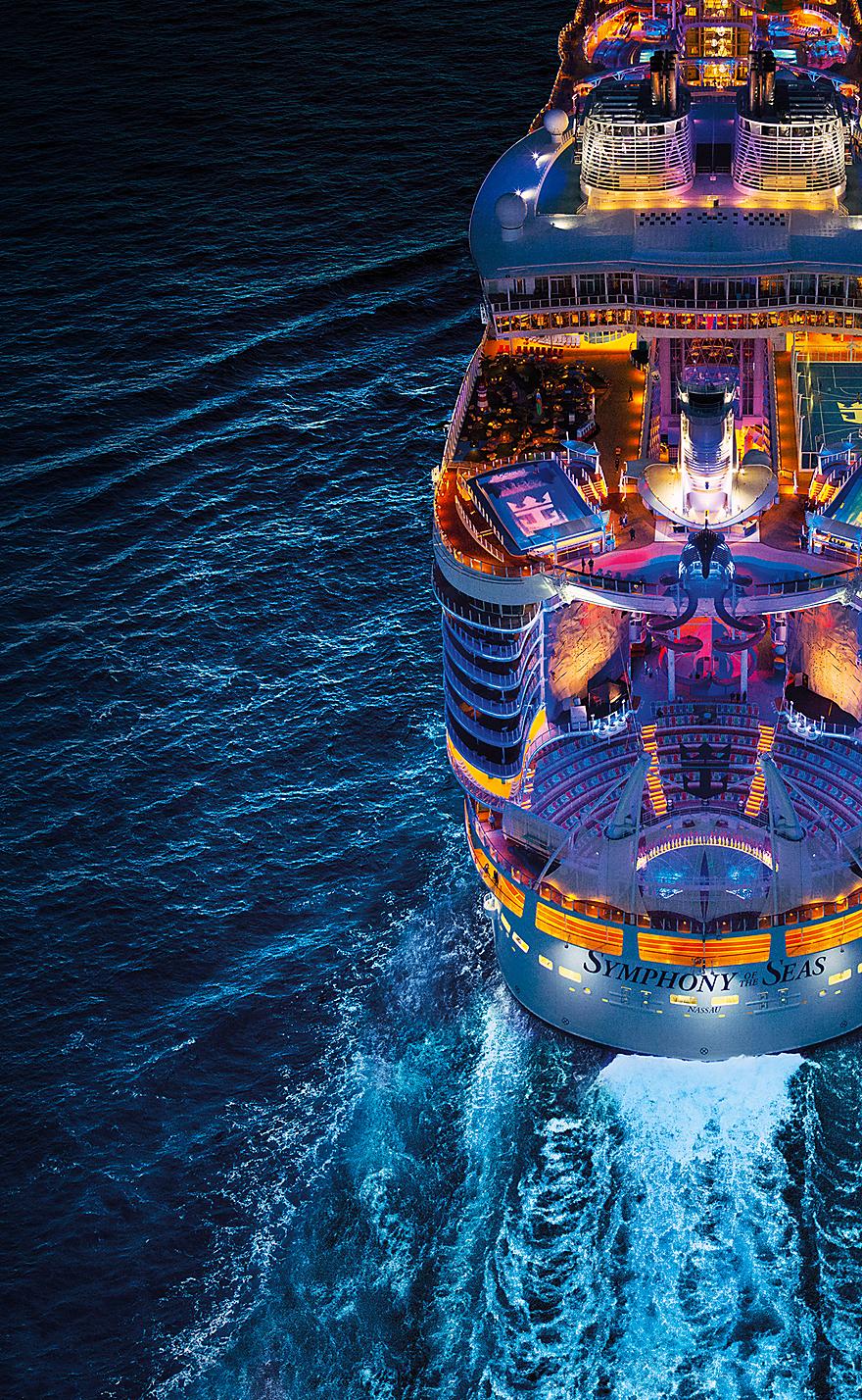 وقتی خورشید غروب میکند، کشتی symphony of the seas چهرهای دیگر به خود میگیرد. نمایشهای این کشتی در سطح برادوی و لاسوگاس هستند.
